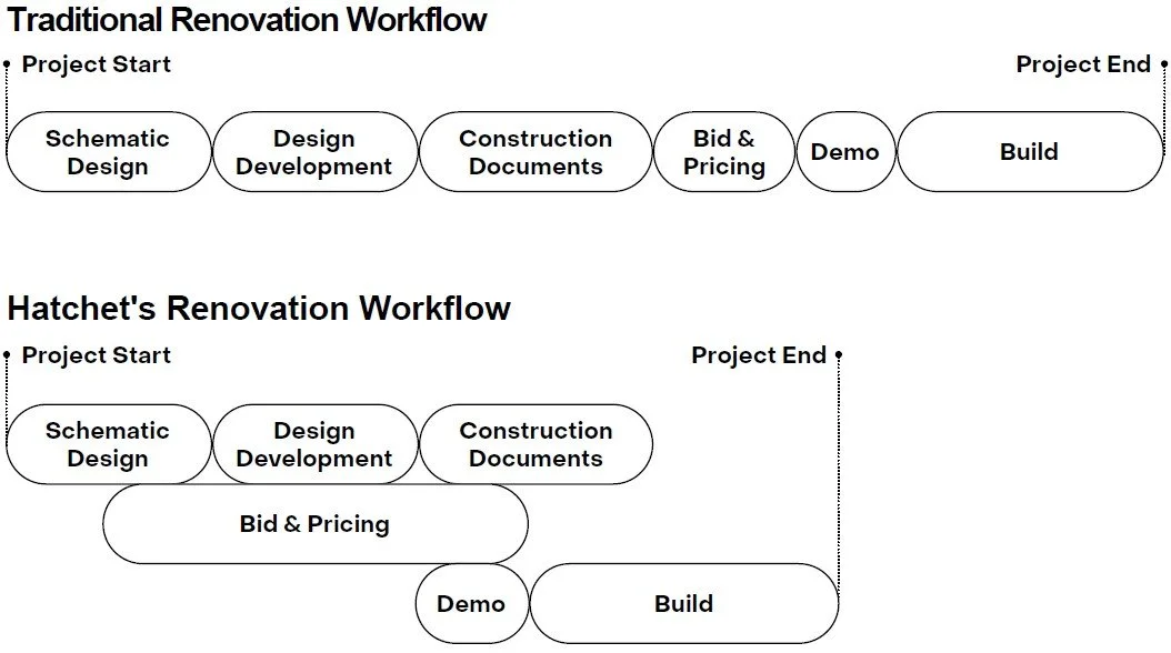 Having designers under the same roof as a construction company means that the idiosyncrasies of each project become opportunities, rather than obstacles. It is with a relentless commitment to craft, material sensibility, and collaboration, that this character comes into view. Hatchet’s integrated services provide a no-nonsense remodeling experience, with fluid communication at every step of the renovation.